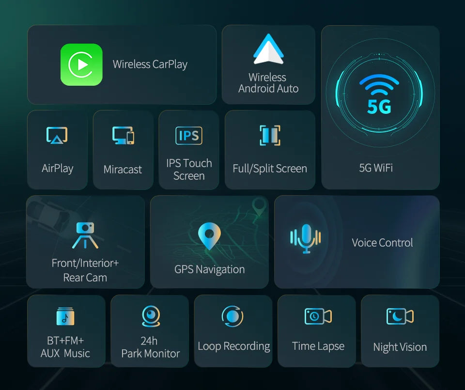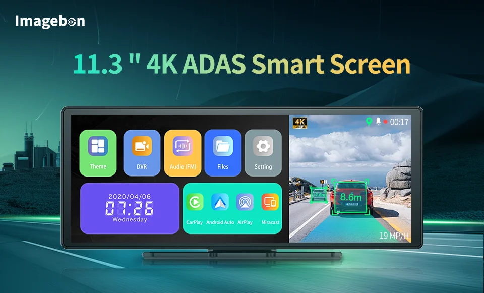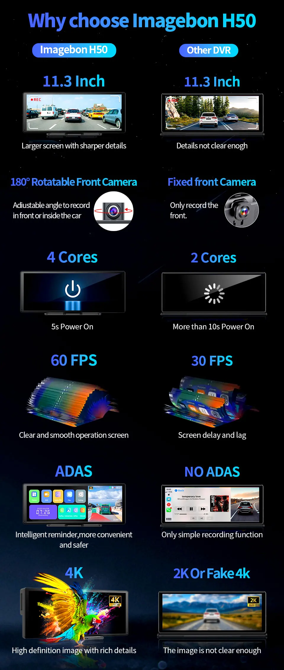 11.3" Imagebon H50 Dash Cam 4K ADAS Wireless CarPlay & Android Auto 3 Channel Recording Time Lapse 24h Park Monitor Black Box