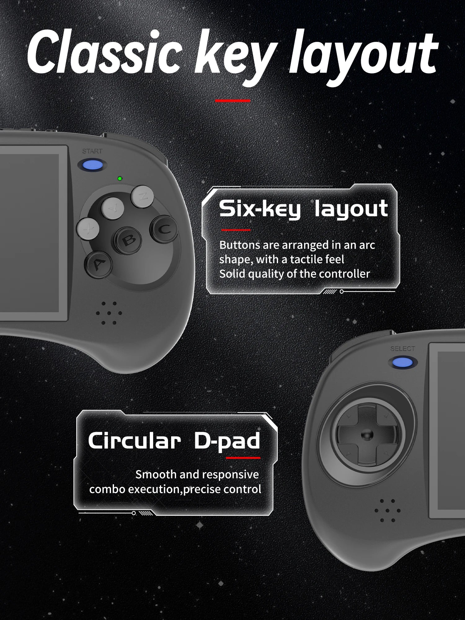 RG ARC-D adopts a classic button layout, designed with six buttons A/B/C/X/Y/Z. The buttons are arranged in an arc with concave and convex shapes,you can feel the solid handle quality from the inside to the outside. The disc cross Buttons to make your gaming experience more comfortable.