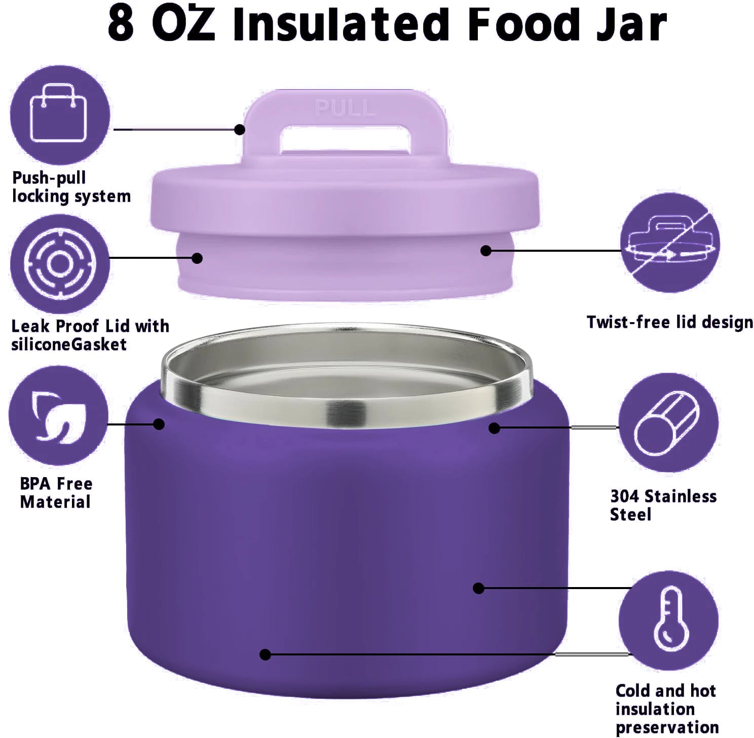 8oz Hot Food Jar - 8oz insulated stainless steel food jar maintains food at a high temperature of 6 hours and a low temperature of 12 hours through double wall vacuum insulation, which can hold hot food or liquids well And it can be put into the lunch box, making it easy for kids to open and enjoy delicious food.
