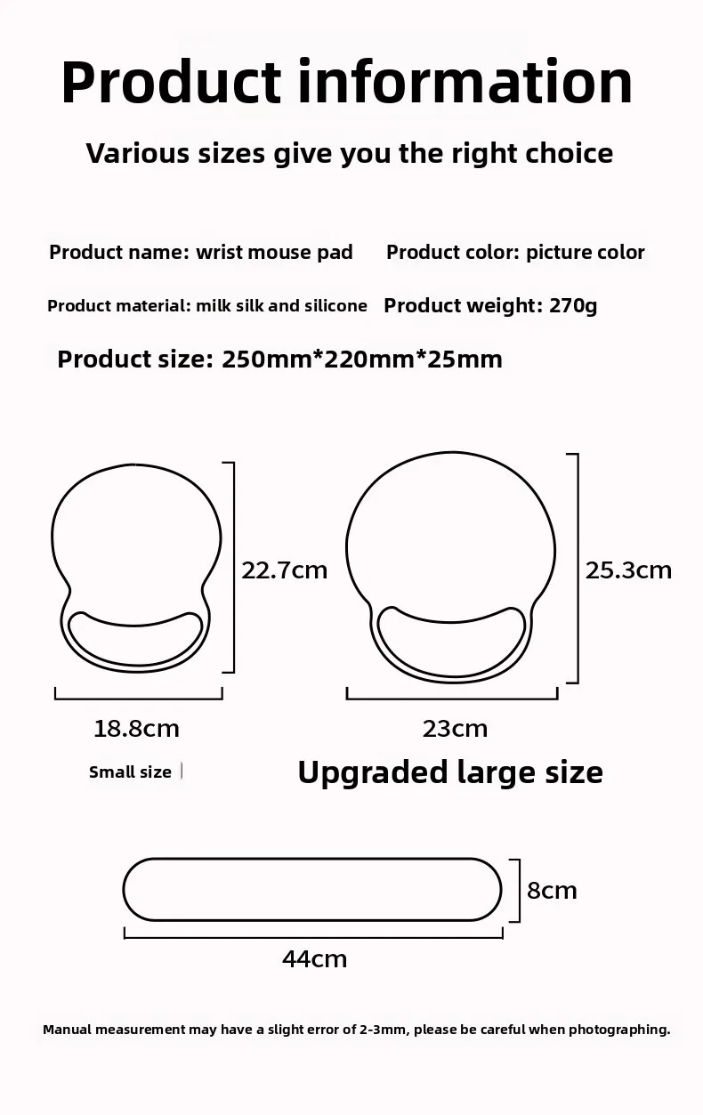 4. Ergonomic design: The design of the wrist guard conforms to ergonomic principles, which can effectively reduce wrist fatigue caused by long-term use of the mouse, provide good support for the wrist, reduce direct contact and friction between the wrist and the desktop, and reduce the risk of problems such as "mouse hand".