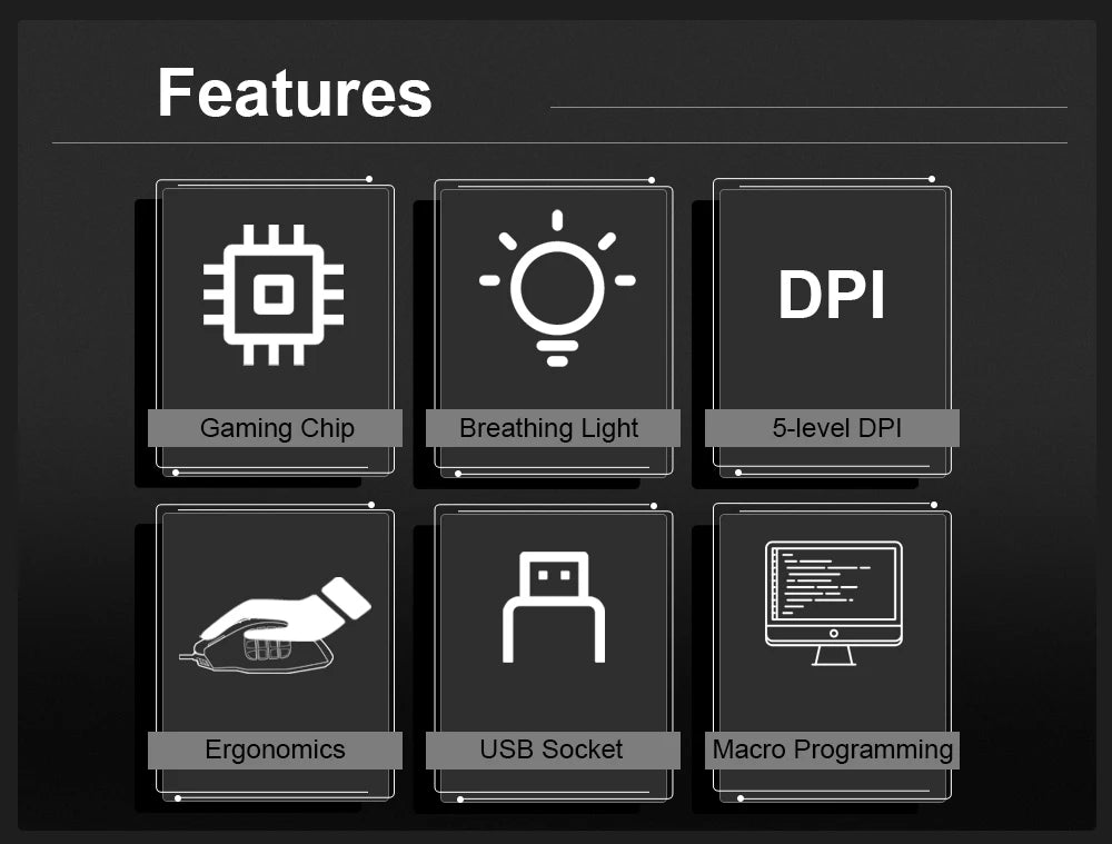 Acme adjustable DPI to 16400-equipped with 5 onboard DPI levels (1000/2000/4000/8200/16400), can accurately position the mouse movement. Each of the 5 DPI levels can be easily customized via software, allowing you to quickly switch to DPI settings.