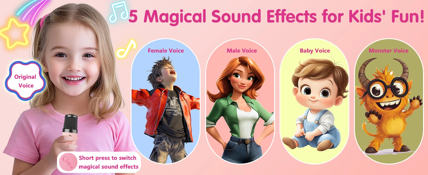 Enjoy karaoke fun with 5 magical voice options! The LED lights change automatically with the music, creating a lively atmosphere for your party! Equipped with 2 wireless microphones, parents can sing and play with their children! The portable mini karaoke machine is perfect for carrying around!