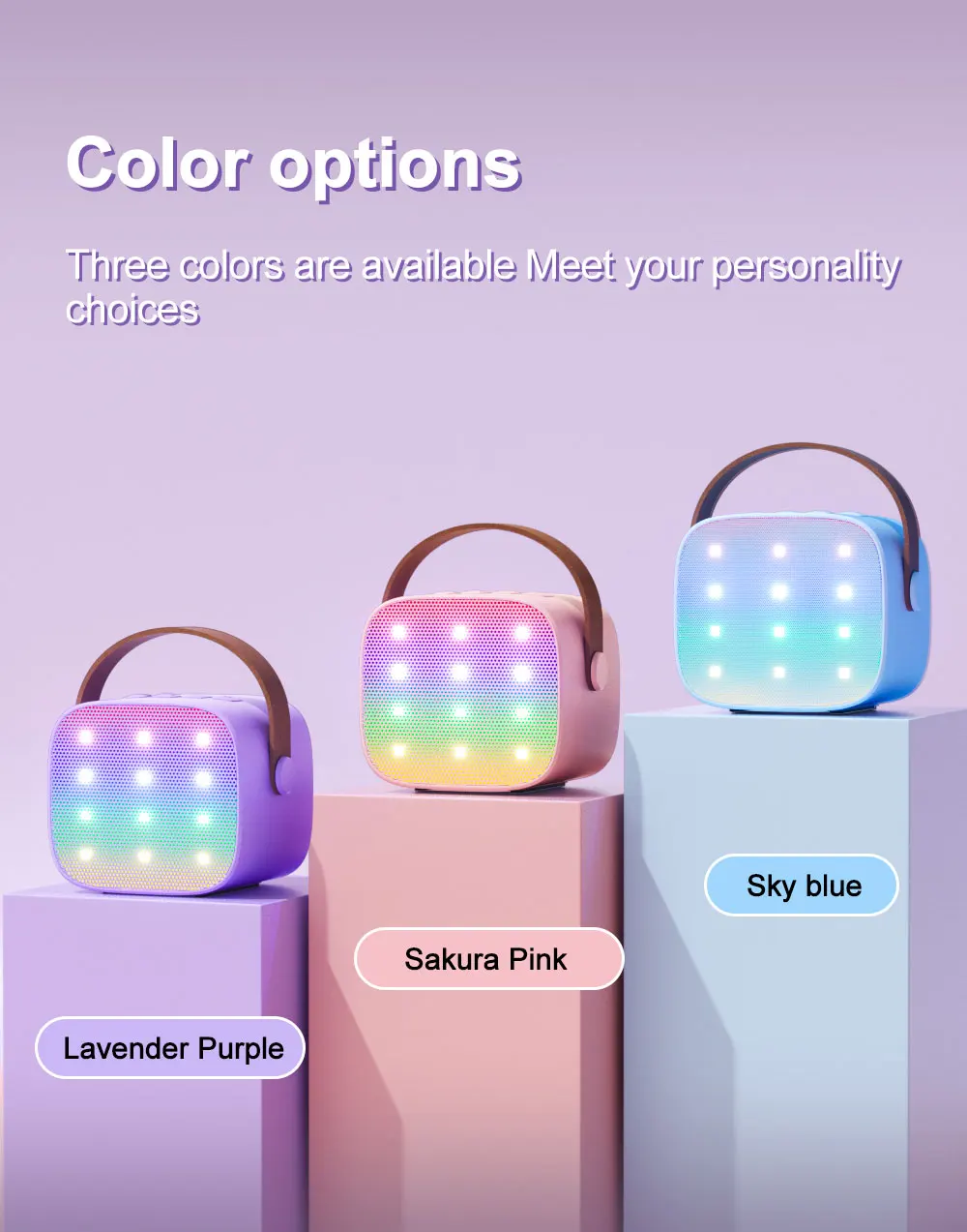 The mini karaoke machine is equipped with a 1200mAh high-efficiency lithium-ion battery, which can play music continuously for 5 hours. The microphone also has a built-in 200mAh high-efficiency lithium-ion battery. Whether it is dancing indoors or gathering outdoors, children can enjoy themselves without any interference. The durability will provide you with a fun-filled birthday party, meeting, classroom, family singing event.