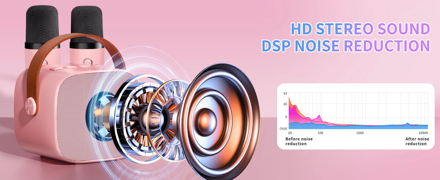 Our karaoke machine is equipped with high-performance 6W stereo speakers, which bring fuller bass and clearer, louder sound quality, bringing you a superior sound quality experience. Even at the maximum volume, the vocals are still flawless and distortion-free.