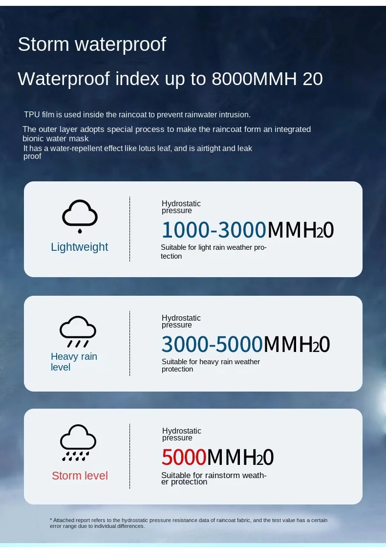 The rainwear is made of EVA, which is safe and durable to use, comfortable to wear.