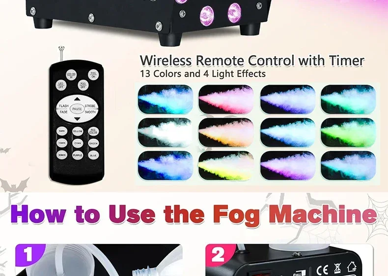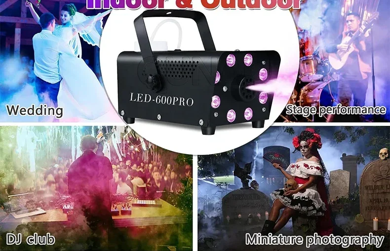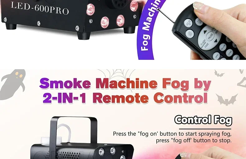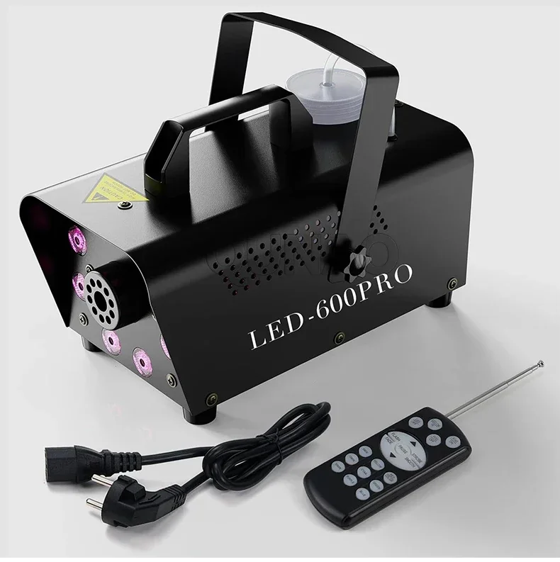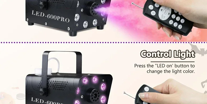LED-600PRO work with a remote and can work with timer mode; The best feature of this smoke machine is Few accessories, multiple functions and stable quality, it uses one remote control to achieve the functions of multiple remote controls and it is different from other smoke machines because it has an automatic smoke function,it can work LED ON or OFF;Select a single color .