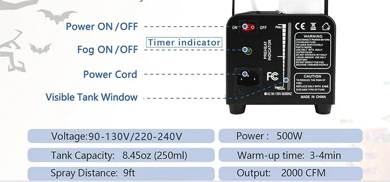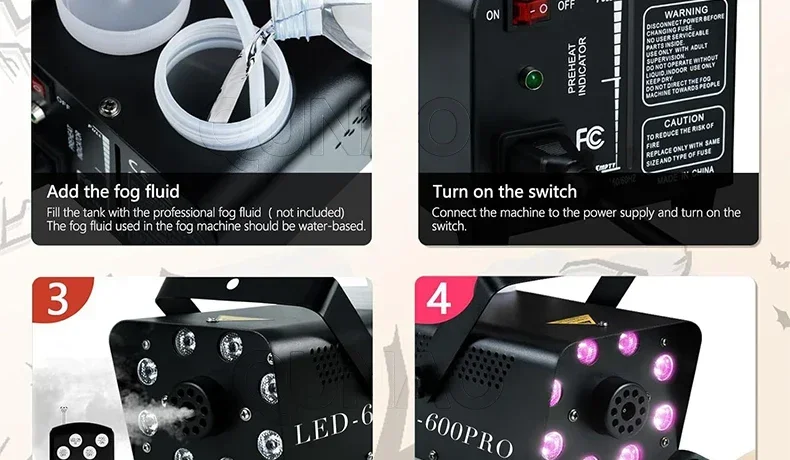 1.Starts preheating. After 2-3 minutes, the fog machine will make a sound