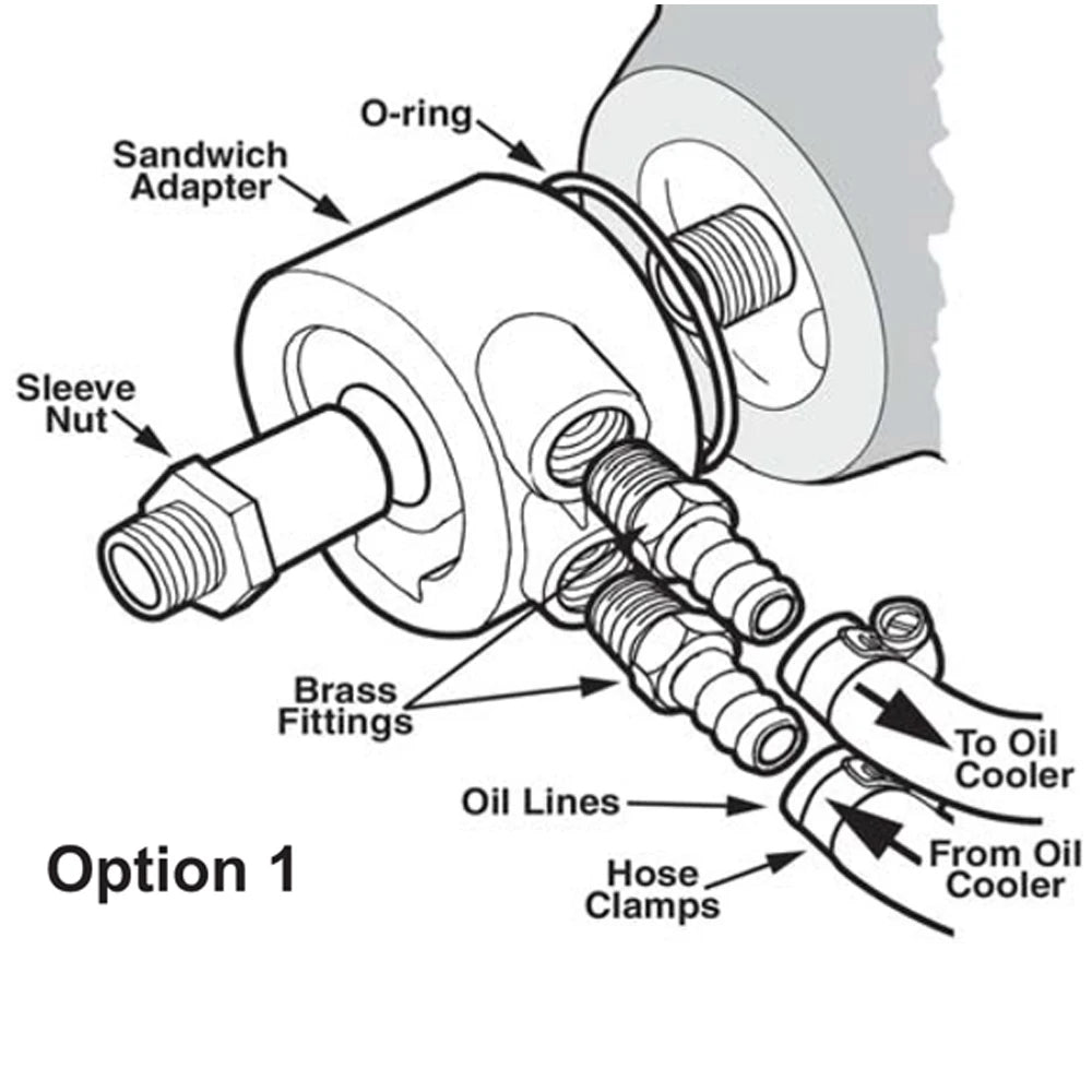 A Sandwich adapter permits the installation of an engine oil cooler without relocating the oil filter and retain functions of a oil temperature and/or pressure probes.