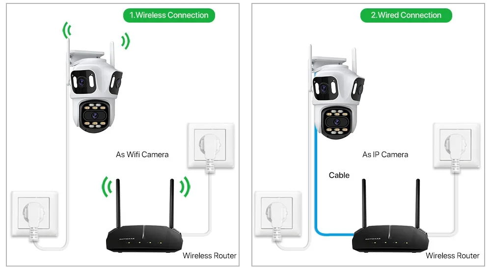 Powered by DC 12V adapter, you can connect the camera to Wi-Fi network. you can setup wifi connection of the camera or LAN Search with network cable connected to router, work with 2.4G wifi only (Does not support 5G).